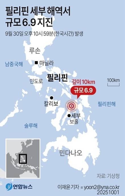미국 지질조사국(USGS)에 따르면 지난달 30일 오후 9시 59분(현지시간) 필리핀 세부섬 북부의 해안 도시 보고시에서 북동쪽으로 약 19㎞ 떨어진 해상에서 규모 6.9의 강진이 발생했다.
