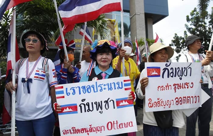 방콕에 있는 주태국 캄보디아대사관 앞 지뢰 규탄시위 / EPA 연합뉴스
