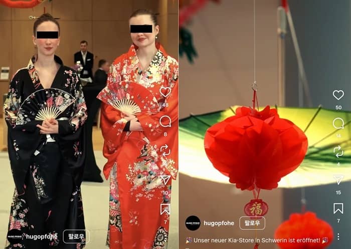 독일에서 문을 연 기아자동차 대리점 개점 행사에 일본 전통 의상인 기모노가 등장해 논란이 일고 있다.