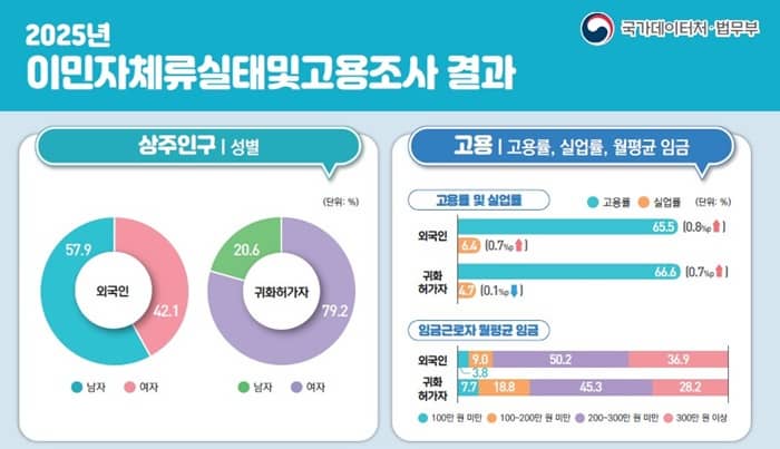 국가데이터처(옛 통계청)가 18일 발표한 ‘2025년 이민자 체류 실태 및 고용조사 결과’에 따르면 지난 5월 기준 만 15세 이상 국내 상주 외국인은 169만2천명으로 작년보다 13만2천명(8.4%) 증가했다.