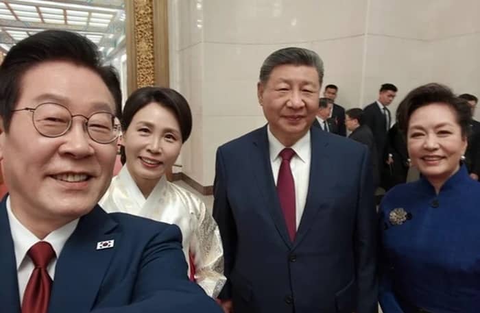다시 베이징 상황으로 화면이 바뀌며 두 정상이 함께 셀카를 찍는 모습이 담겼다. 자막에는 ‘한·중 첫 셀카가 아닐까’라는 문구가 등장했다. 사진 촬영 도중 김혜경 여사와 펑리위안 여사도 합류해 함께 사진을 찍었다. 이 대통령이 카메라 구도를 조정하는 장면과 김 여사가 “치마 밟지 마시고”라고 말하는 모습도 영상에 포함됐다.